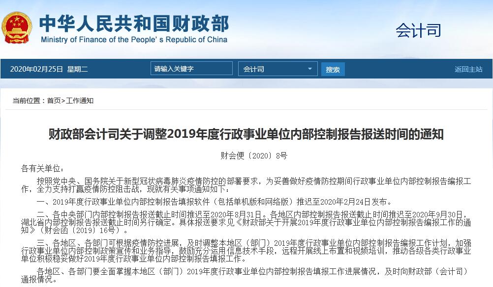 財政部會計司關(guān)于調(diào)整2019年度行政事業(yè)單位內(nèi)部控制報告報送...